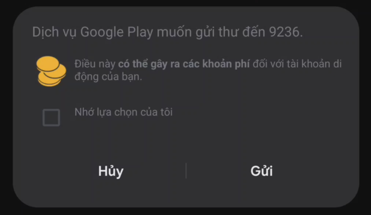 Lưu ý rằng dịch vụ Google Play sẽ cần gửi tin nhắn đến nhà mạng để tiến hành xác minh và điều này sẽ dẫn đến việc tài khoản điện thoại của bạn có thể có các khoản phí theo yêu cầu từ nhà mạng – CHI TIẾT ĐIỀU KHOẢN CỦA GOOGLE VÀ NHÀ MẠNG