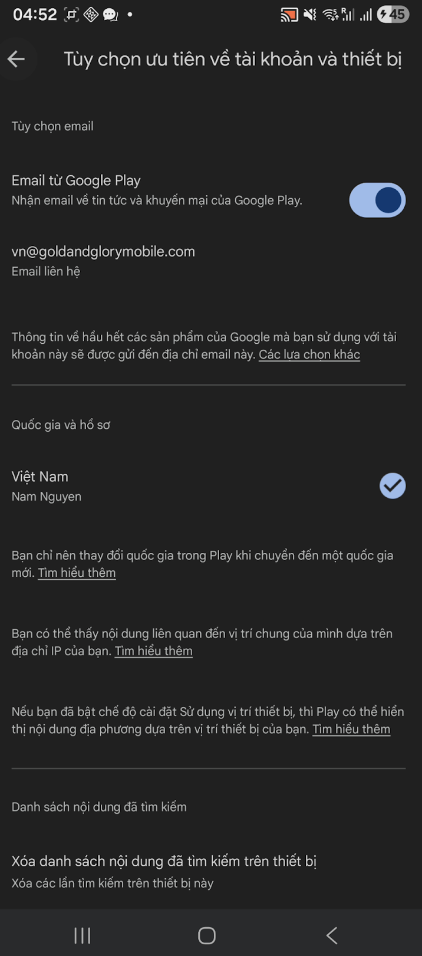 Trước khi nạp thẻ, bạn cần đảm bảo tài khoản Google Play của bạn là tài khoản thuộc khu vực Việt Nam (Google Play -> Avatar tài khoản góc bên Phải -> Cài Đặt -> Chung -> Lựa chọn ưu tiên về Tải Khoản và Thiết Bị)